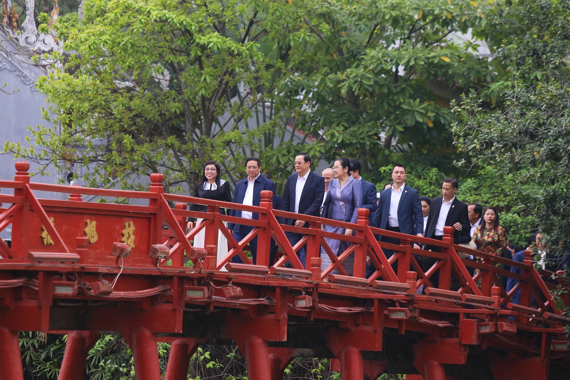 The two Prime Ministers and their spouses visited Thap But (pen tower), Dai Nghien (ink slab tower), The Huc Bridge, Ngoc Son Temple, and learned about the legend of Hoan Kiem Lake.